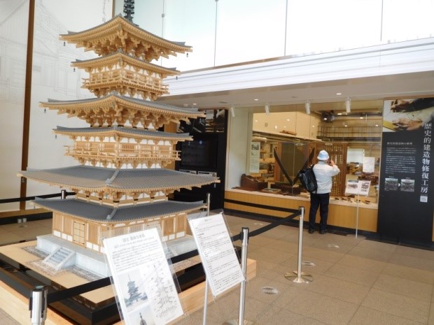 文化財修復・展示棟では、木造建造物の修理(県文化財保存事務所)、土器などの考古資料の復元(天理市教育委員会)、木造彫刻の修理(公益財団法人美術院)、絵画書跡等の修理(株式会社文化財保存)が行われており、ガラス越しに作業が見学できます。文化財の修理を見るのは初めてなので、その緻密な長い作業工程を粘り強く行っていることに唯々感心しました。これらの修復作業を経て文化財が引き継がれ、私たちが接することができます。これは一見の価値があります。