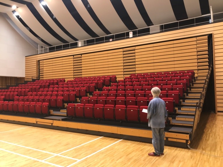 電動可動式観覧席があり、講演会、集会、式典等に利用。観覧席を仕舞えば、バトミントン、卓球等に利用、災害時には、425人の避難スペースとなります。